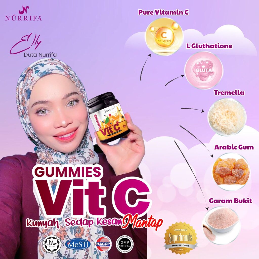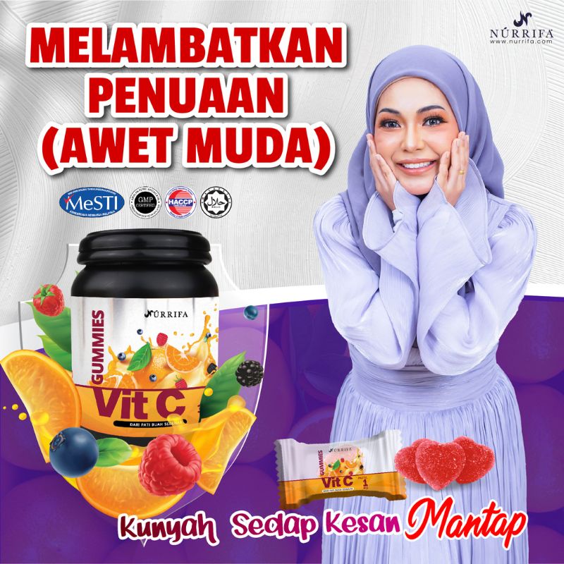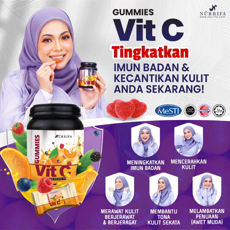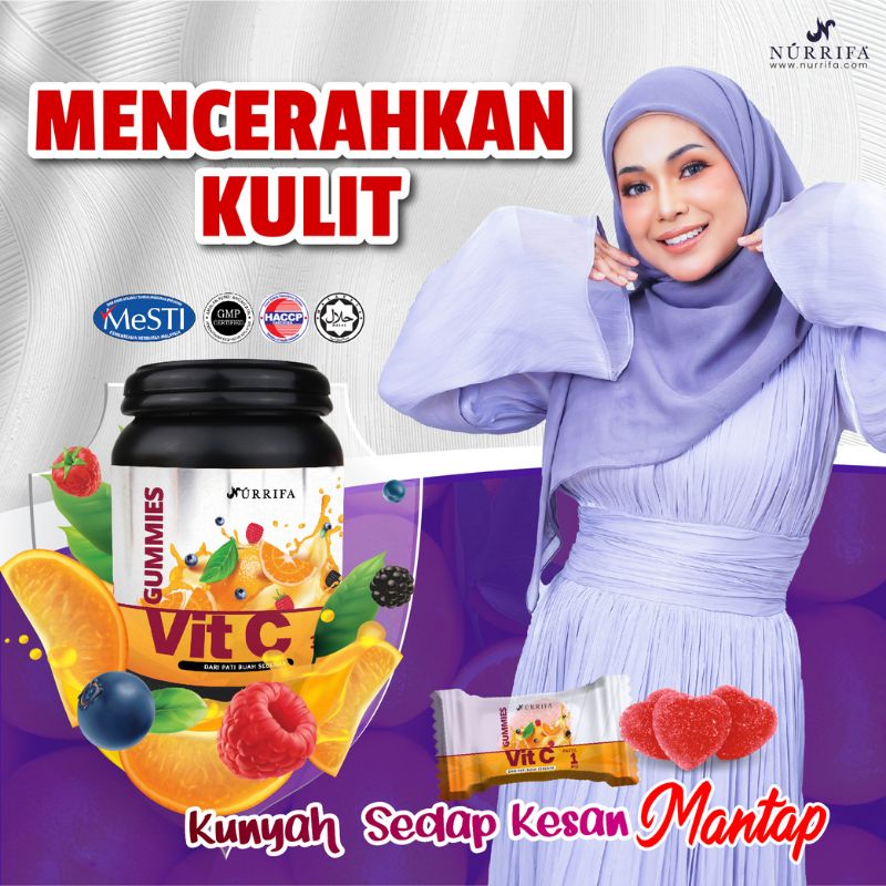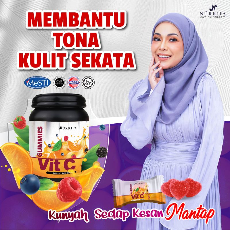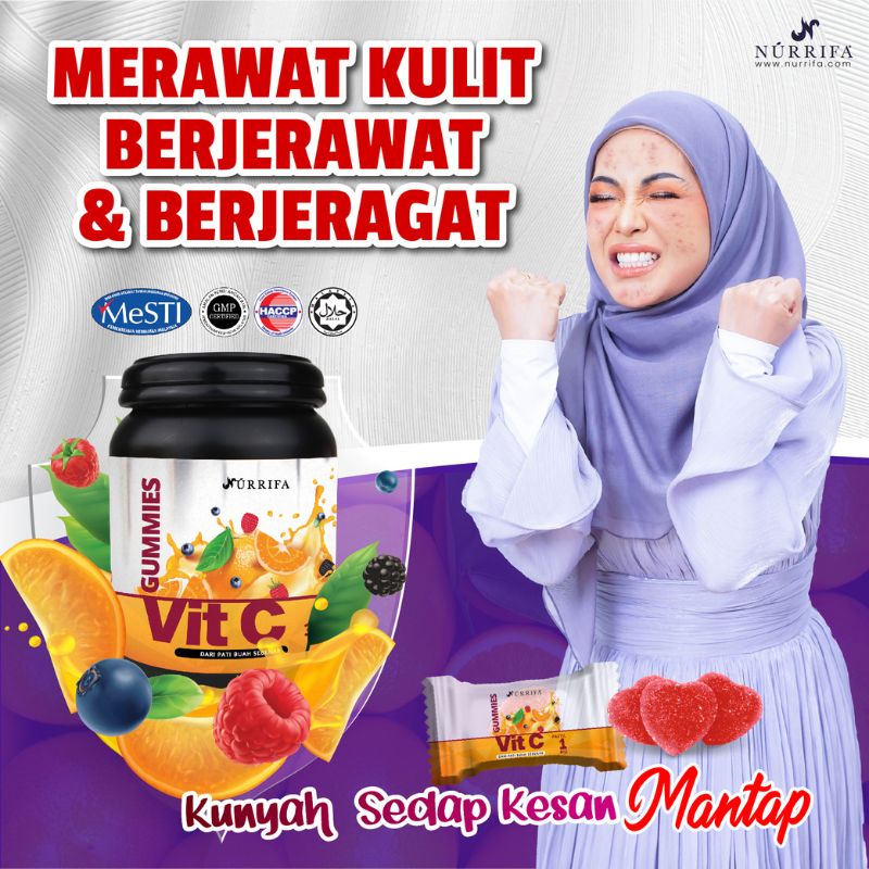 Nurrifa Gummies Vitamin C formulasi baharu diperkaya dengan Pure Vitamin C, L-Glutathione & Arabic Gum yang terbukti berkesan untuk kecantikan & seri wajah.