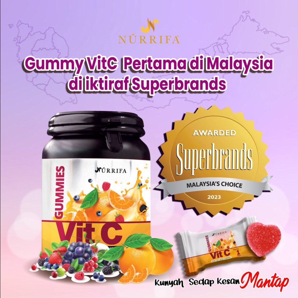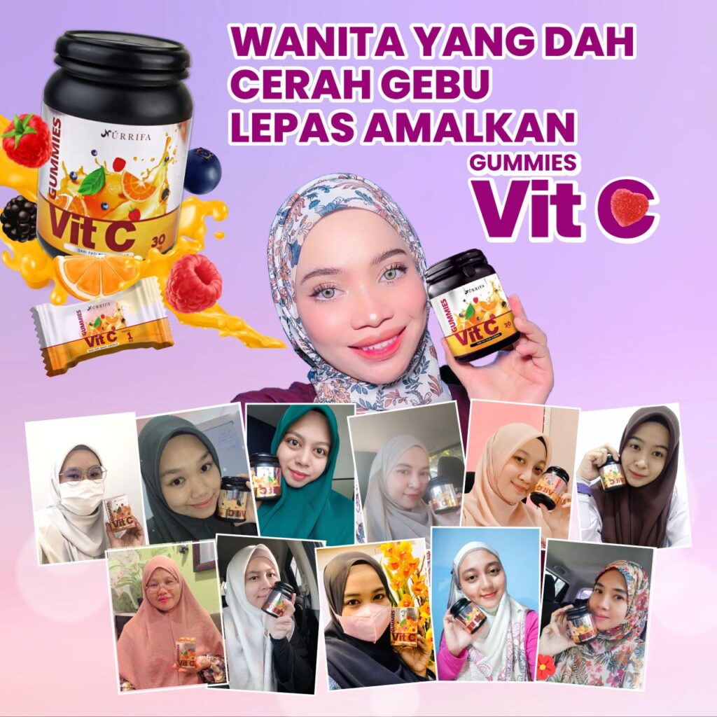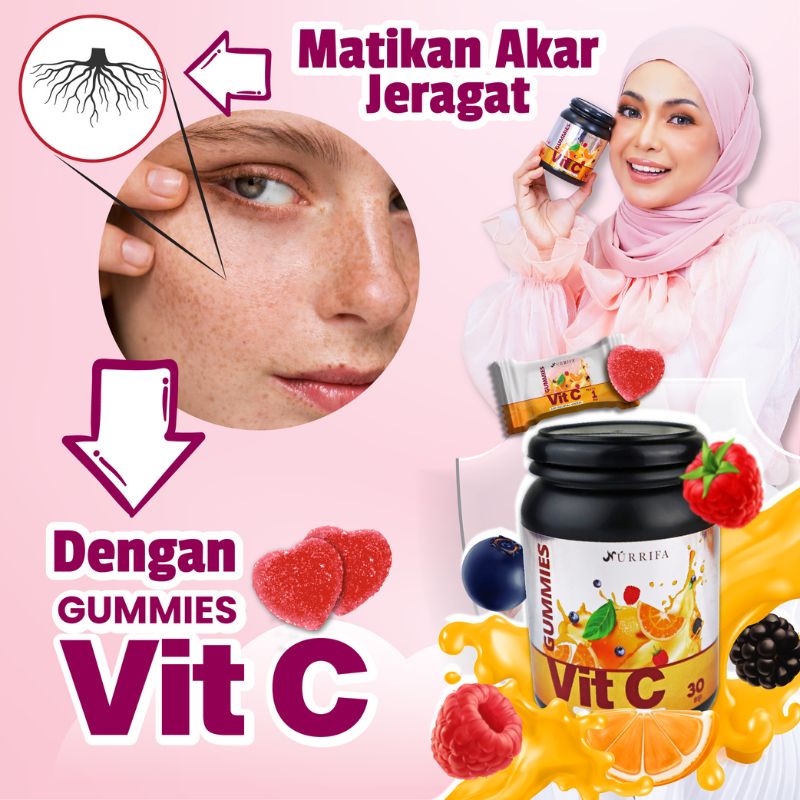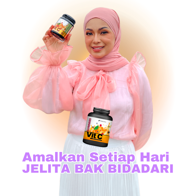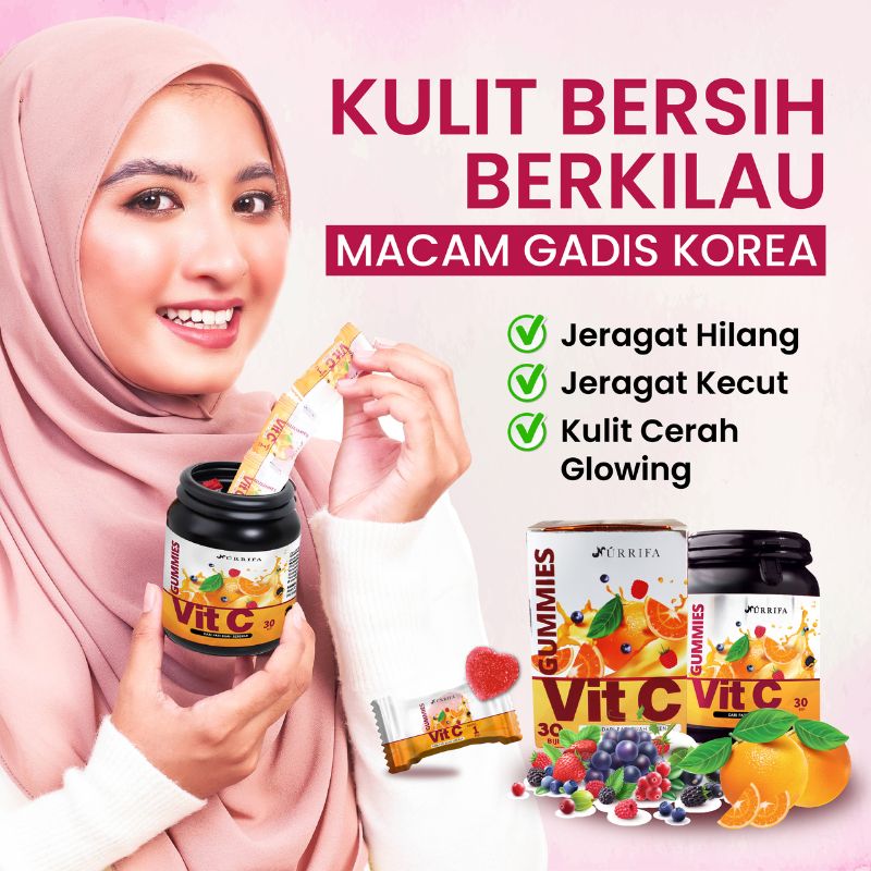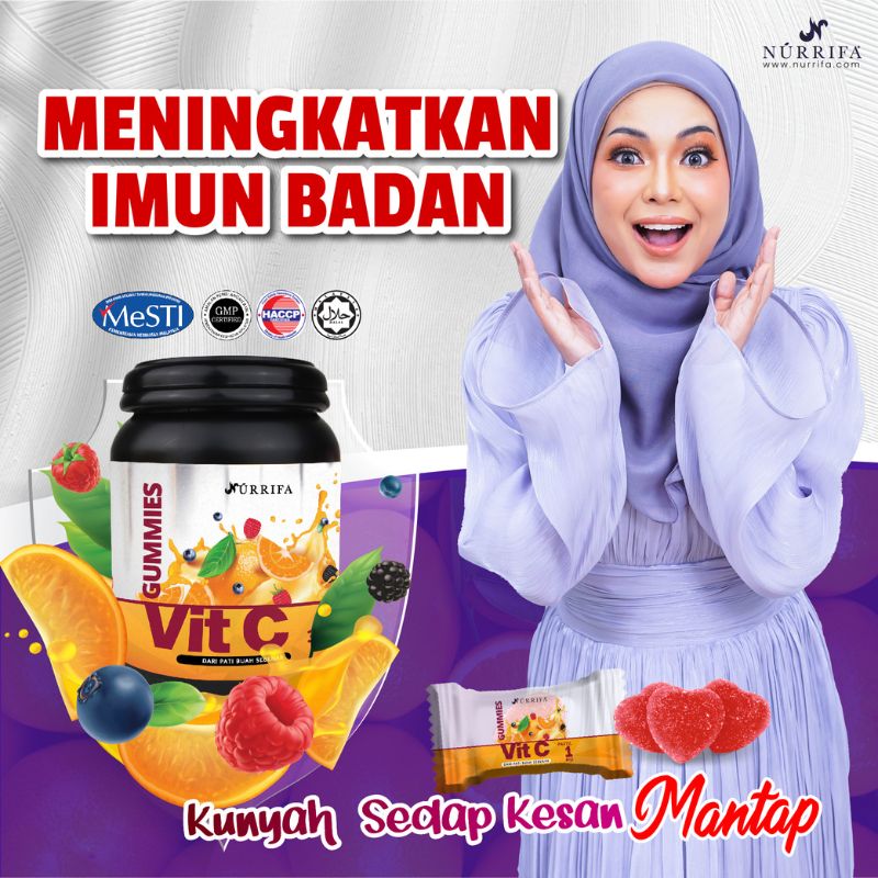 Nurrifa Gummies Vitamin C formulasi baharu diperkaya dengan Pure Vitamin C, L-Glutathione & Arabic Gum yang terbukti berkesan untuk kecantikan & seri wajah.