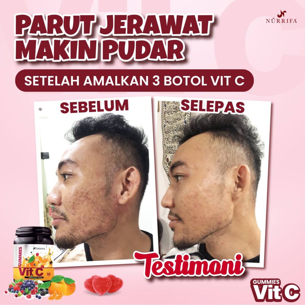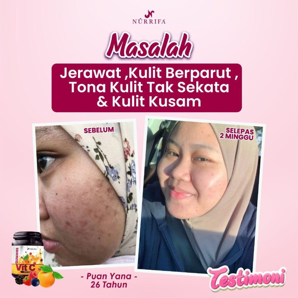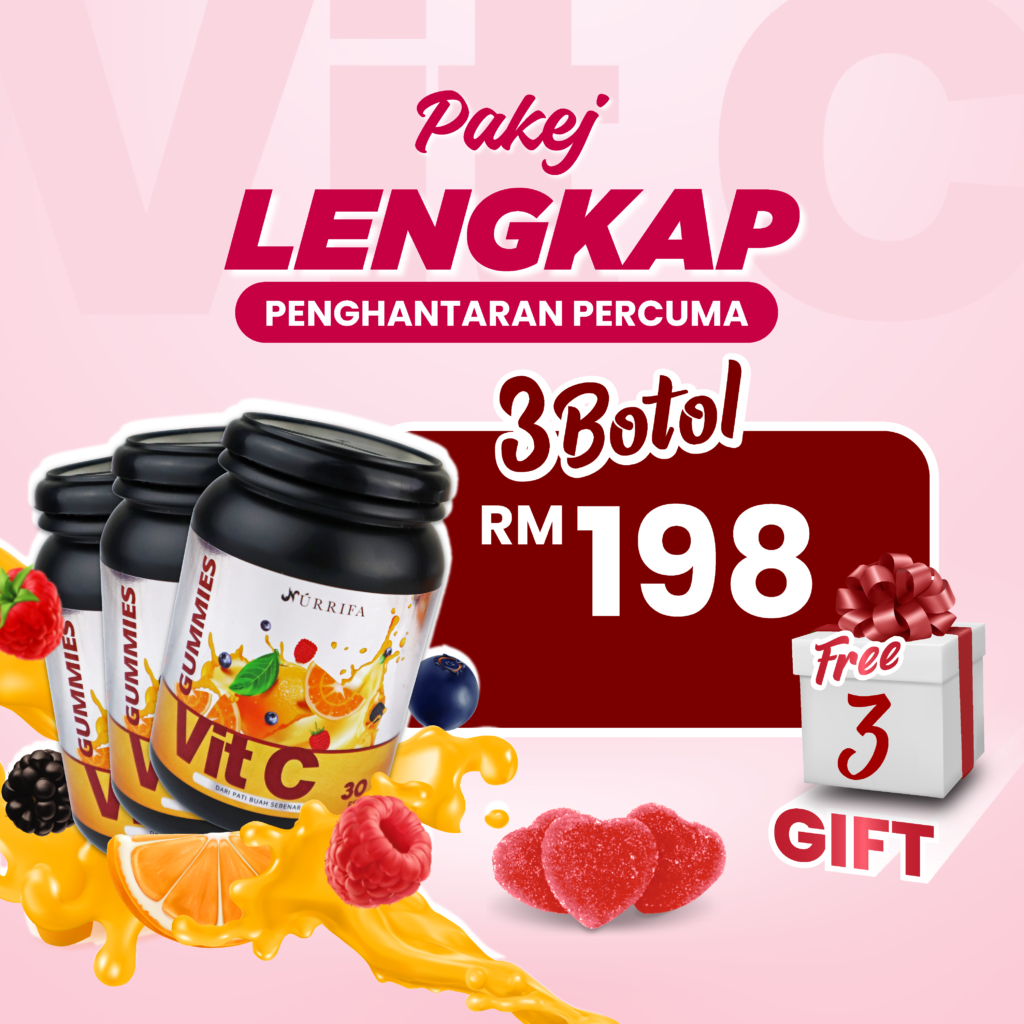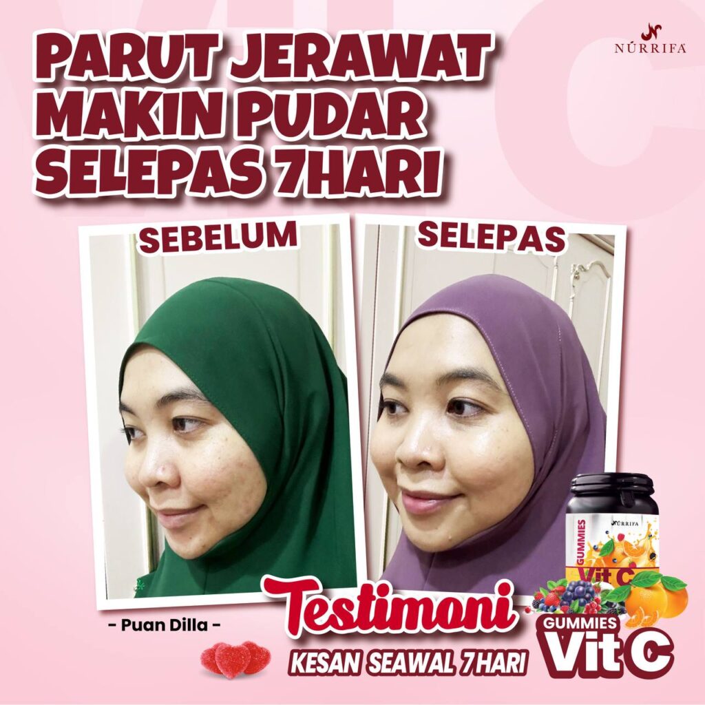 Nurrifa Gummies Vitamin C formulasi baharu diperkaya dengan Pure Vitamin C, L-Glutathione & Arabic Gum yang terbukti berkesan untuk kecantikan & seri wajah.
